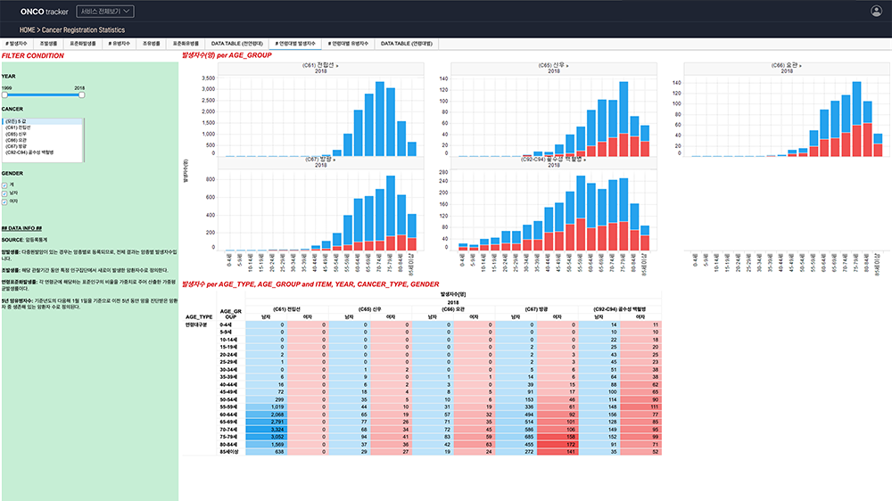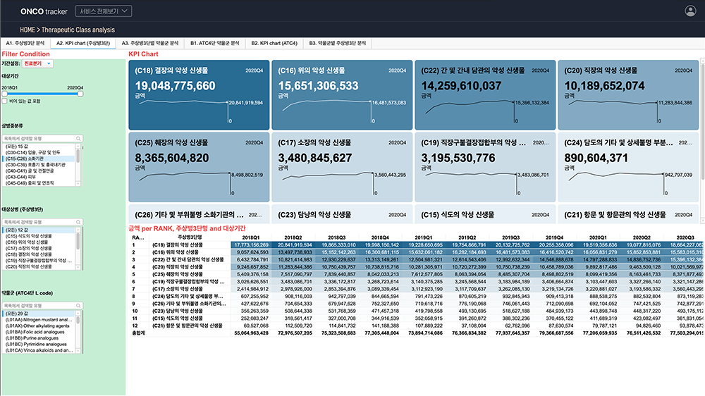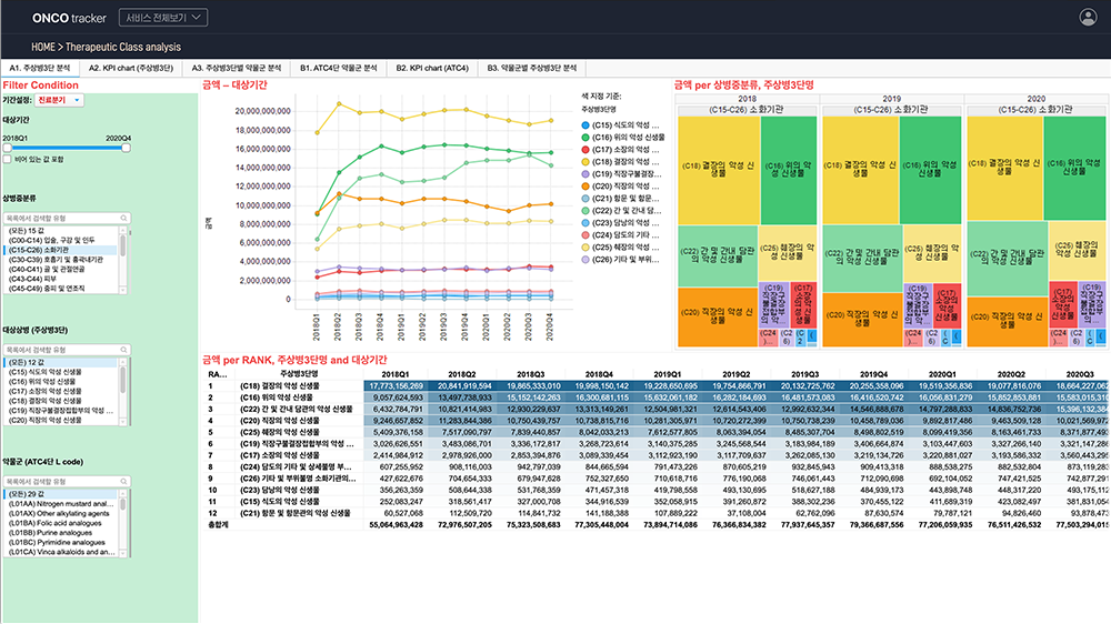 환자수, 처방금액, 진료건수 등을 시군구별/병원종별/과목별 분석하고,